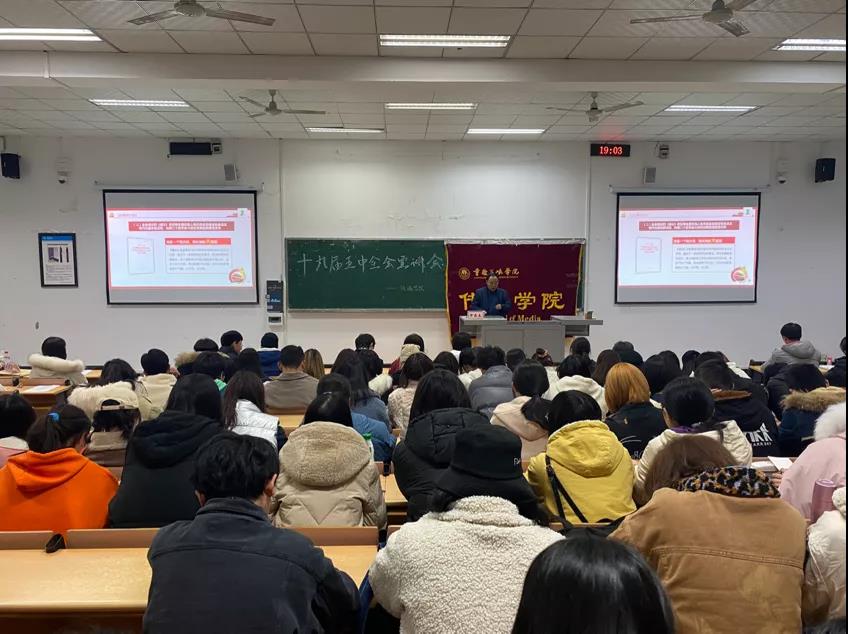为深刻领会党的十九届五中全会的精神实质和丰富内涵,推动学习活动深入校园,12月7日晚上,公司党的十九届五中全会精神宣讲会在明辨二教103举行。2026年国际足联世界杯经理申载春教授作宣讲报告,团总支员工会所有工作人员、各协会负责人参加报告会。