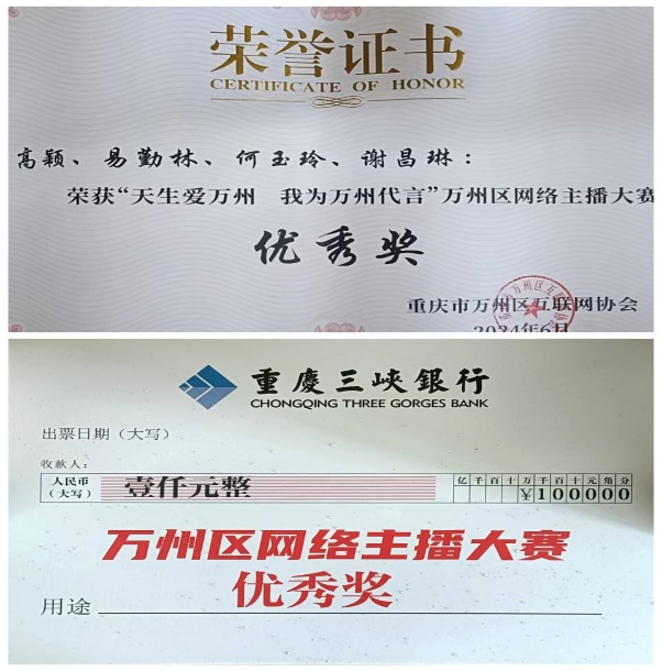 网络主播大赛自2024年4月启动以来,吸引了万州区近200组参赛选手参与,经过初赛、复赛二轮筛选,最终有20组选手挺进决赛。决赛选手包含电视台主持人、电商平台负责人、网络达人主播和高校传媒专业员工等。决赛分为线上网络直播、现场产品推荐、现场主题分享、互联网法律法规知识竞赛四个环节,并采用线上线下双渠道考核进行实时打分。决赛现场上,公司2组参赛选手分别围绕美食万州烤鱼、万州面两个主题,现场模拟直播,展示了较强的传播技巧、互动能力、扎实的语言功底和专业基础,获得评委一致好评,取得三等奖(奖金5000元)和优秀奖(奖金1000元)的优异成绩。