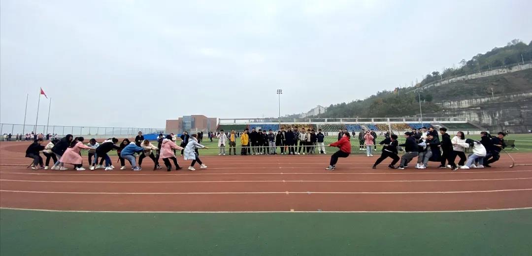 在拔河比赛开始前,班长张海涛带领班级队伍做好热身运动。慢跑一圈后,紧张刺激的拔河比赛拉开帷幕。比赛中,男女生脱去了厚重的棉袄,轻装上阵,形成了两支队伍。两边的选手齐心协力,热情高涨,咬紧牙关拉动绳索,在一片欢声笑语中完成了两轮比拼。