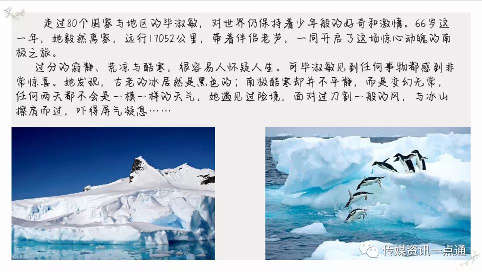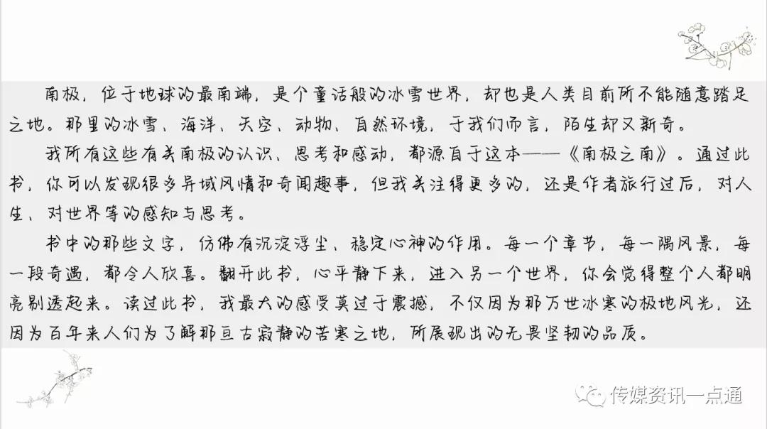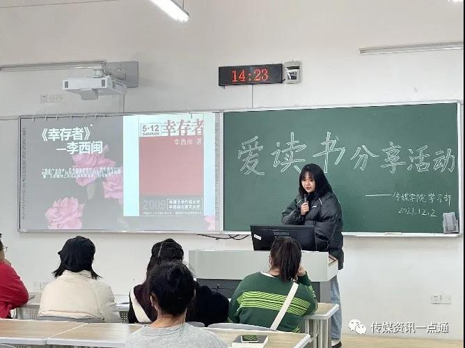 杨美玲同学给我们带来的《人生就是小欢喜》,她指出这本书分为成长,生活,青春,爱情。她采取了新颖的Vlog的形式为我们展现了这本书,她说:“每天能读这几页书,就是我的小欢喜”。之后,《南极之南》这本书由张艺腾同学以PPT的形式带给我们,她主要分为了三个部分:作品简谈,感悟一二,最后的最后。“对生命的善意与真诚,如涓涓细流般穿透人心。”