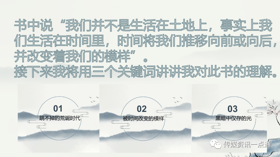 李暄同学带给我们余华先生的《在细雨中呐喊》,同时给我们分享了余华先生在朗读者中的一段话,带我们进入主题,采取了PPT的形式给我们分享该书,并发表了自己的感悟并对此讲解:跳不出的荒诞时代,被时间改变的模样。除此之外,李暄同学向我们推荐了余华先生的其他作品,如:《活着》。