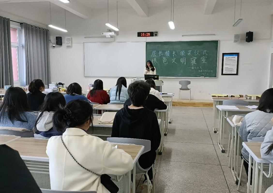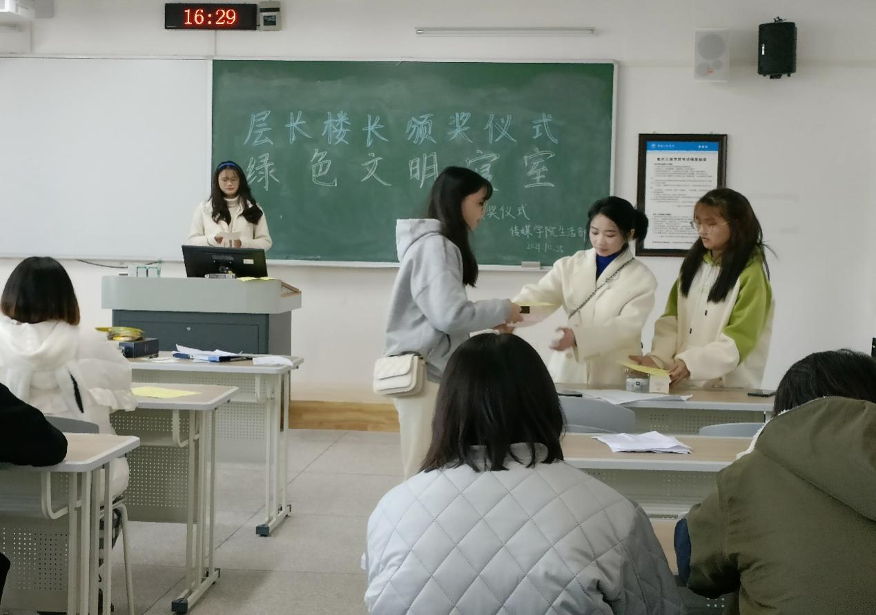 会议开始,主持人介绍颁奖活动,宣布获奖人员名单,接着生活部负责人漆姌为文明层长楼长颁奖,获奖成员领取他们的奖励,最后文明层长楼长颁奖活动在11月25日下午五点圆满结束。