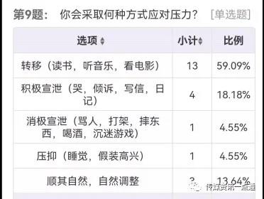 从中可以看得出同学们对待生命和及时宣泄情绪的态度是积极向上的,对生活是充满希望和乐观的。但同时也要看到所在问题,同学们普遍认为造成老员工轻视生命的原因在于学习工作压力大。所以要给同学们做好健康的心理辅导,及时疏导同学们紧张的学习精神,缓解学习压力,带动大家进行更多的娱乐活动,放松心情。另外也要给同学们树立良好的择业观,正确的择业观能让他们对生活充满信心,对未来更加向往。