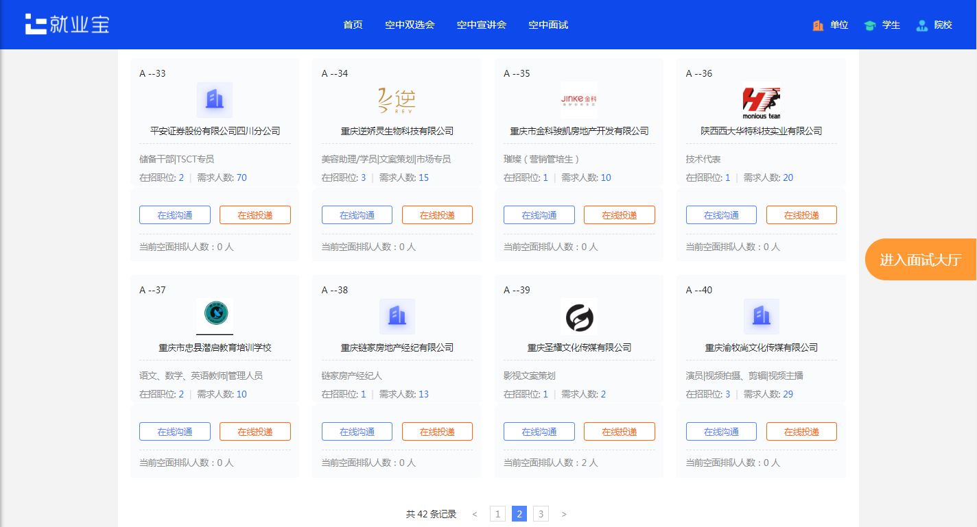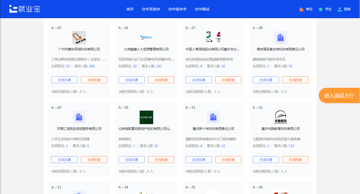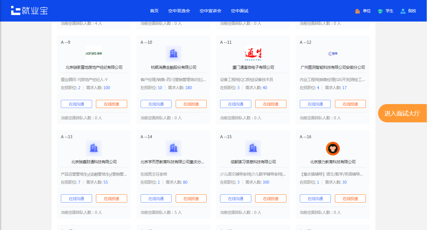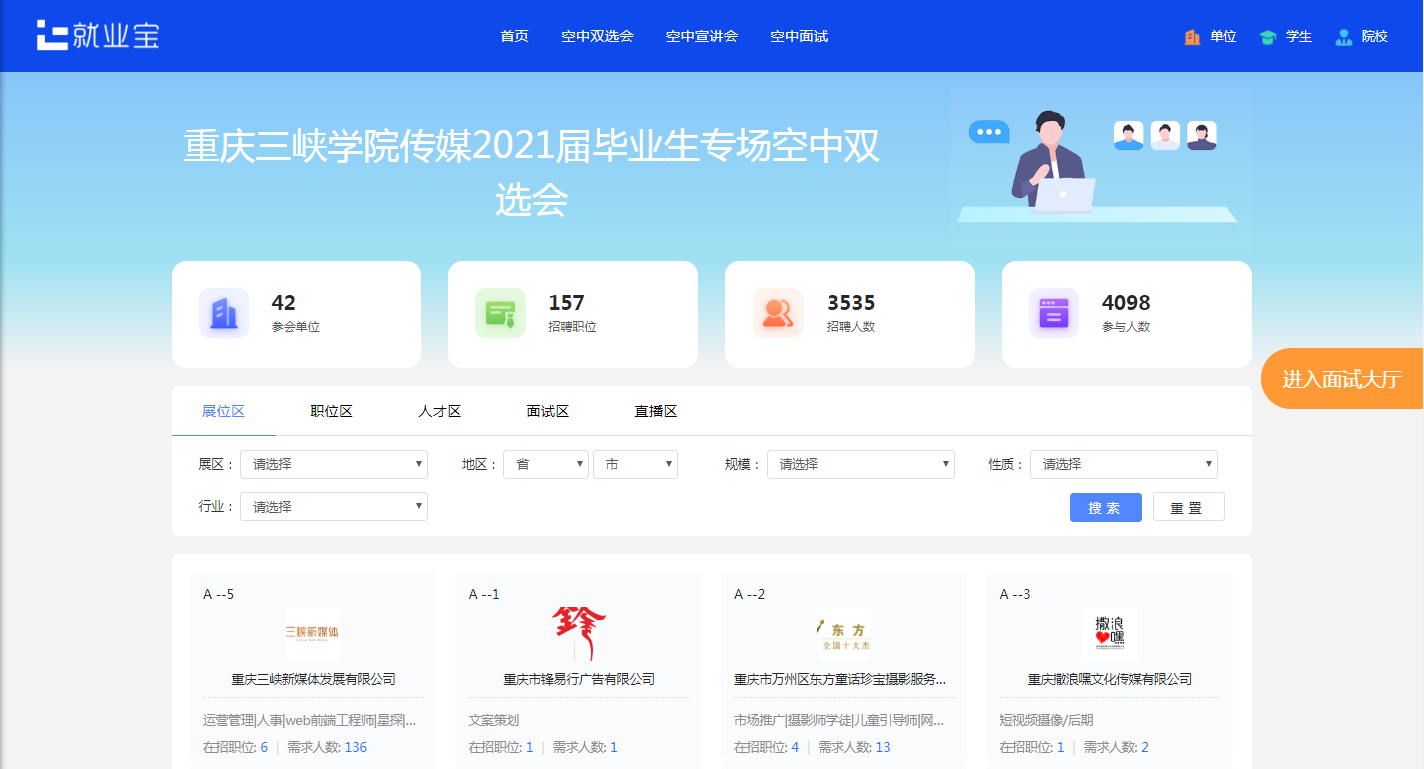 本次双选会共有113分简历投递,直接空中面试30场。吸引全国其他九所高校员工参与就业。共吸引4098人参与关注。
